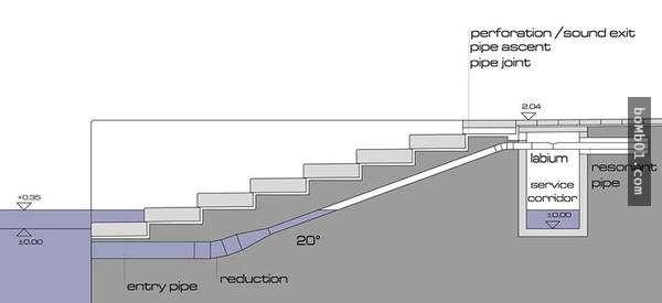 ▼在階梯中的35根不同直徑、長短不一的管子,隨著海浪拍打、水與空氣的擠壓,把大海變成風箱,搭配管風琴一般低沉的和絃,形成和諧、絕無僅有的歌曲。