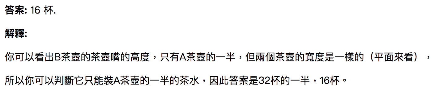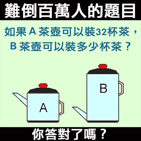 這題難倒百萬人!A茶壺可裝32杯,那B茶壺裝幾杯?