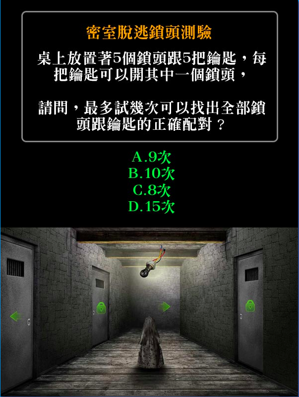 解答: 第一把鑰匙最多試四次(前四個鎖頭都不對的話,就知道是第五個鎖頭,不用試第五次), 第二把鑰匙最多試三次(第一把鑰匙已配對的鎖頭不用試,其他同上), ...依此類推,總共要試4+3+2+1=10次。