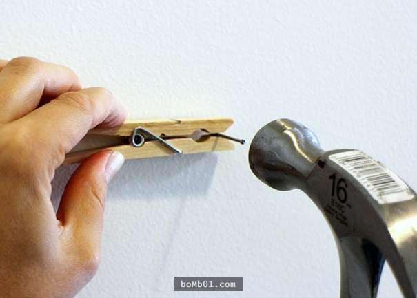 ▼10. 使用錘子時可以用曬衣夾固定釘子就不會傷到手。