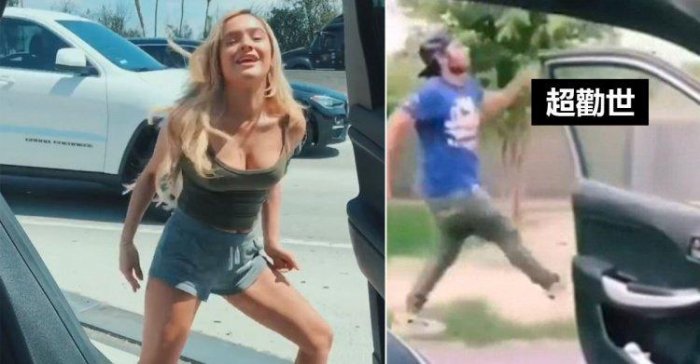 你看這個女生,從後座打開車門,下車就是熱舞,幾度快跟不上車子,最後驚險回到車上,而一輛大卡車隨即駛來。