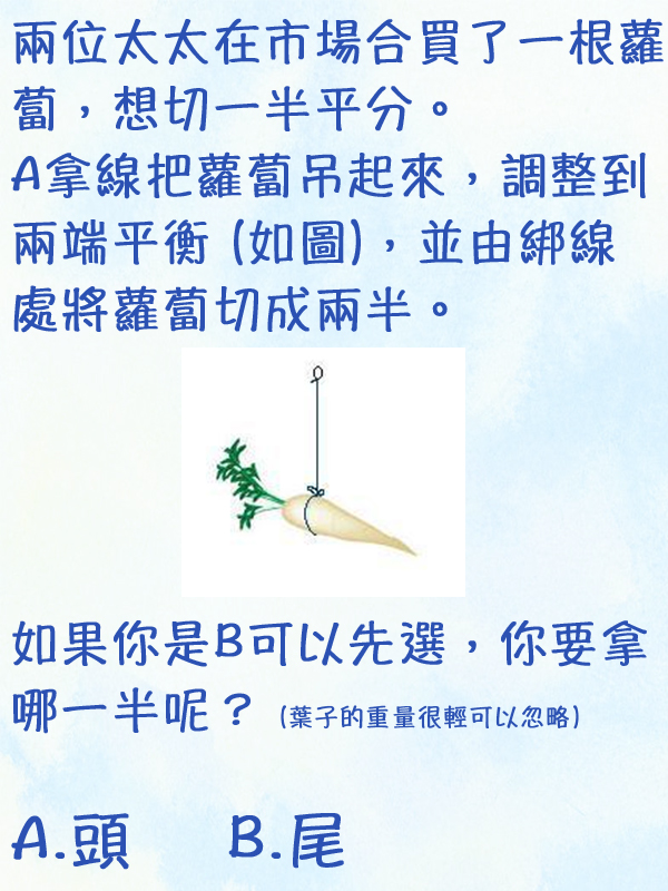 故拿線吊起蘿蔔平衡的時候,頭部的一端到綁線處一定會比較短,尾部則較長。
