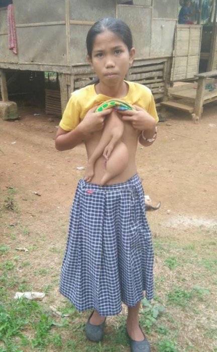 在菲律賓有個14歲少女Veronica的肚子上,長出一雙手臂。