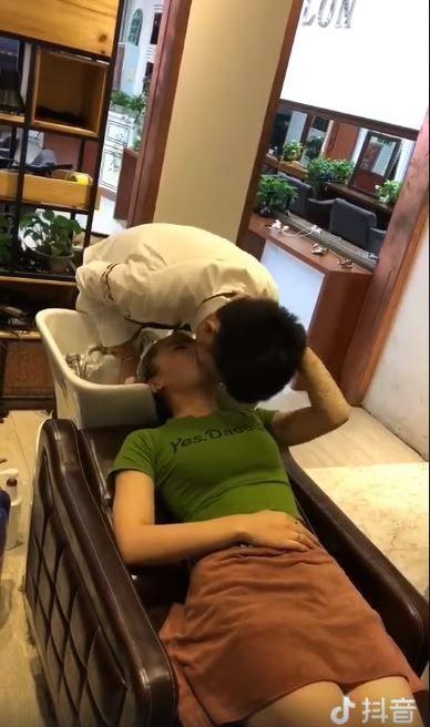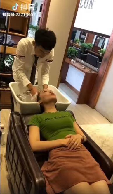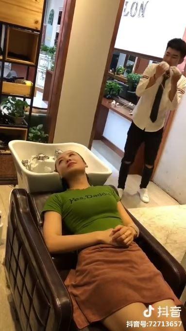 最近熱傳一段抖音片,一名女子在洗頭時,冷不防突然抓起男設計師的頭