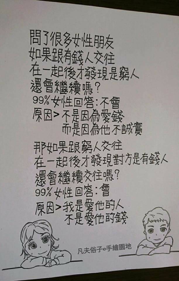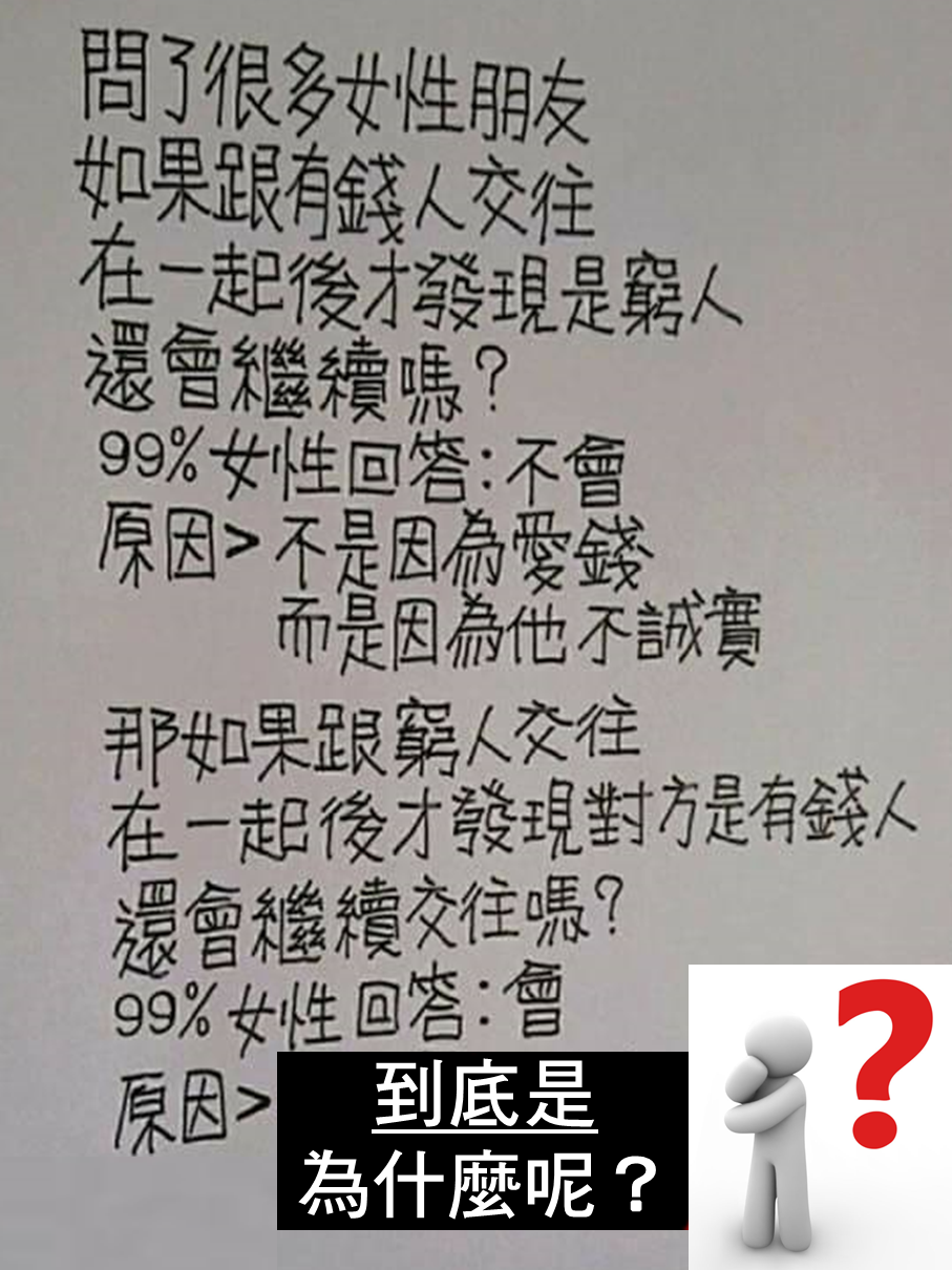 〖爆趣99%女性回答Yes的問題:「如果你跟窮鬼交往,在一起之後才發現對方是有錢人,你還會繼續交往嗎?」 然而,為什麼呢