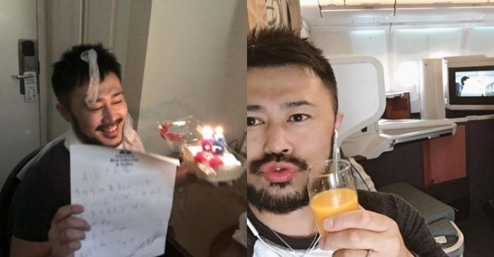 這名39歲的男子最近投稿旅遊資訊評價網站《4Travel》,指控全日空國際線的空服員,沒有跟他講生日快樂,他特別選在這一天搭乘飛機,就是想說可以在空中度過39歲的生日:「明明這次的上空生日非常值得紀念!期待他們有所表示的我,真是個笨蛋!」。當天頭等艙只有四個人,空服員完全沒發現他是壽星,讓他坐在飛機上空歡喜了十個小時!