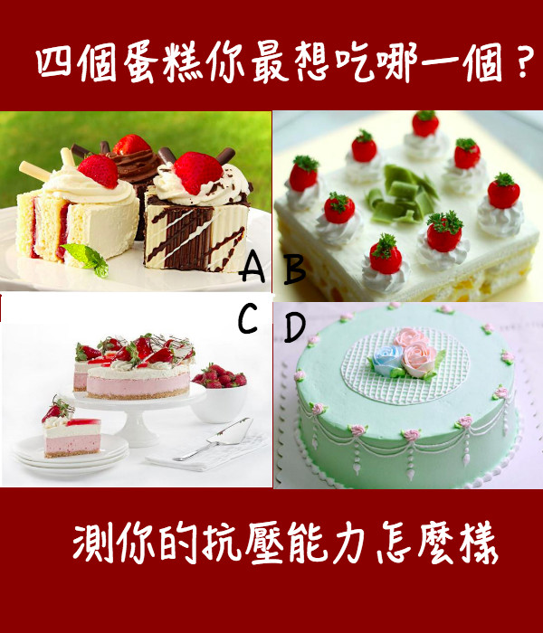 選擇最後一個蛋糕的人抗壓能力還不錯,在百分之七十左右,你的抗壓能力好是應為你本身就是一個比價成熟的人,對於生活有規劃。 所以在面對壓力的時候你往往就會理性的分析,認真對待。