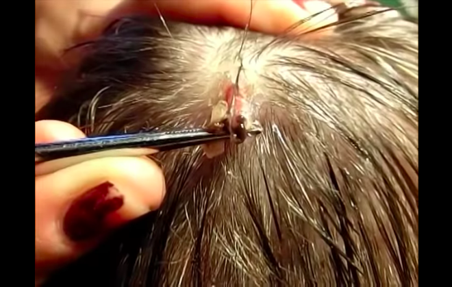 ▼一個月後,他頭皮裡的蛆蟲已經又肥又大。Simon覺得時候到了,於是請朋友幫忙,用鑷子把蛆蟲夾出來。