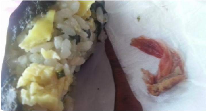 每次外出用餐,爸爸媽媽都會說:「外面的東西不乾淨」。你可能以為他們說的是食材問題,其實有時候情況比這嚴重得多。不久前,一名網友從超商買回海苔飯糰充飢,正吃得滿足時突然看到裡面有奇怪的東西。他取出來之後再也吃不下去,因為那竟然是一條沾血的OK繃。