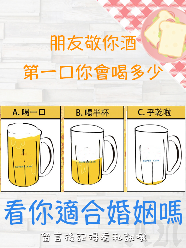 選「喝一半左右」的朋友你是結婚型 年紀到了心也想安定的你會想要找對象結婚:這類型的人覺得自己要什麼或者喜歡什麼樣的人都知道了,