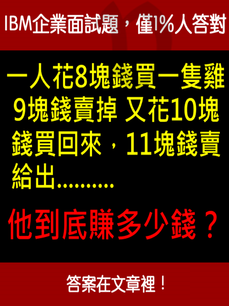 1個人,花8元買隻雞。9元賣出去。10元買回來。11元再賣出去。請問他賺了多少錢?