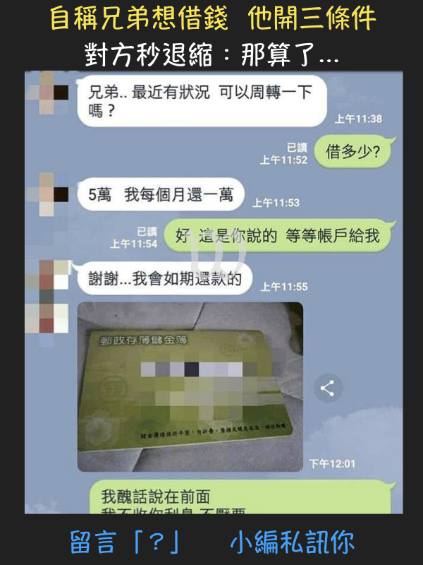 網友們看到後紛紛表示:「借錢是花錢買仇人~真的夠朋友會去跟銀行借,不會跟朋友借」、