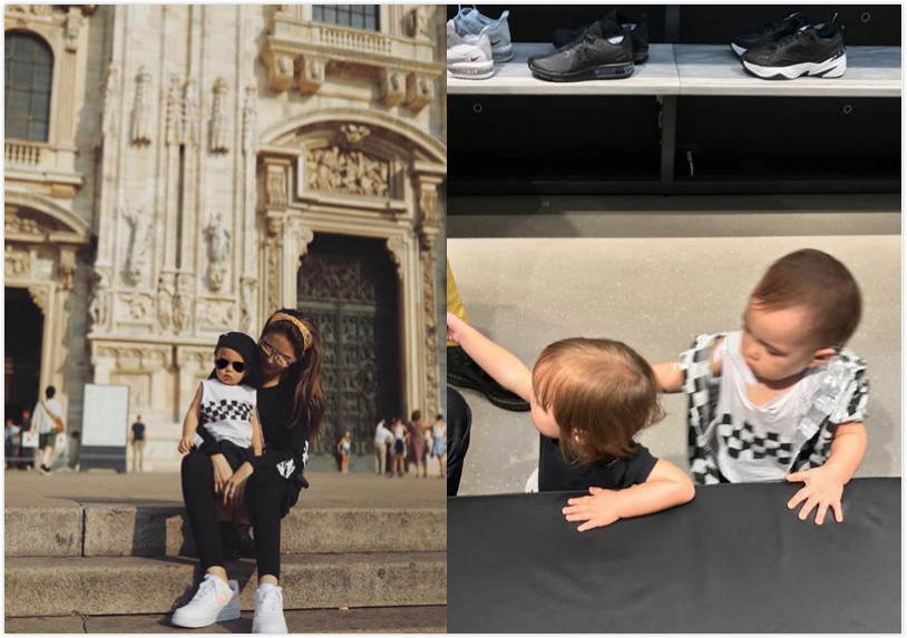 昆凌近日赴米蘭參加時裝周,帶著一家人同行, 21 日在 IG 上傳一張疑似和兒子 Romeo 的合照,一身黑衣裝扮的昆凌坐在階梯上, Romeo 坐在她的腿上,這也是 Romeo 首次正面對外曝光,擺出酷酷的表情,眼睛則被 P 上一副墨鏡。