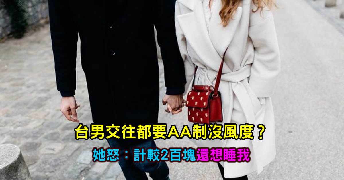 男女之間花費AA制究竟好不好?一名女網友近日在臉書「靠北男友」抱怨,指出新加坡及馬來西亞的男性,即使與異性只是普通朋友也會主動幫付飯錢,但在台灣男性卻似乎什麼都得AA制,甚至會因「身分」不同而有區別,讓她感慨台男真的很沒風度,這番言論也引起大批網友熱議。