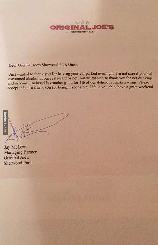 ▼剛開始Paula以為是罰單,沒想到仔細看過後竟然是一封感謝信。「親愛的顧客,感謝您將車停在這裡過夜,不管您有沒有在我們餐廳飲酒,我們都要感謝您沒有酒後駕駛。隨信附上一張招待券,可以免費兌換一磅雞翅。請接受這份禮物,作為我們對您負責任的感謝。」