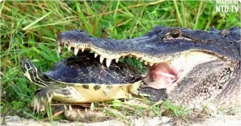 c▼不久前,來自美國的攝影師Tim Harrell就在佛羅里達州的自然公園裡,拍攝到了非常罕見的一幕,原來當時正好有一隻短吻鱷補抓到了「獵物」,但…無論牠再怎麼咬,獵物都始終毫發無損,因為那是一隻擁有「美國隊長盾牌」級別硬殼的烏龜啊!