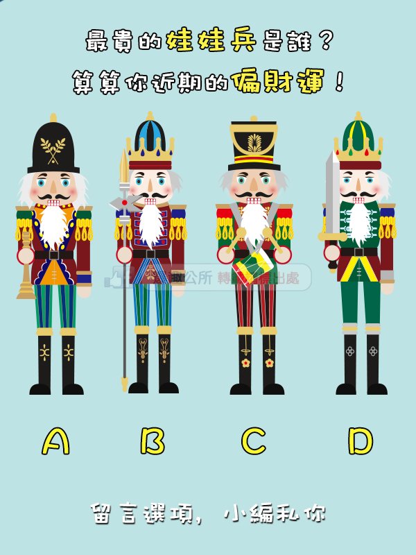 B:你近期的偏財運不太樂觀,建議你保守理財,不要去做盲目的投資,或是期待中樂透之樂的意外財,努力工作腳踏實地才是最重要的。