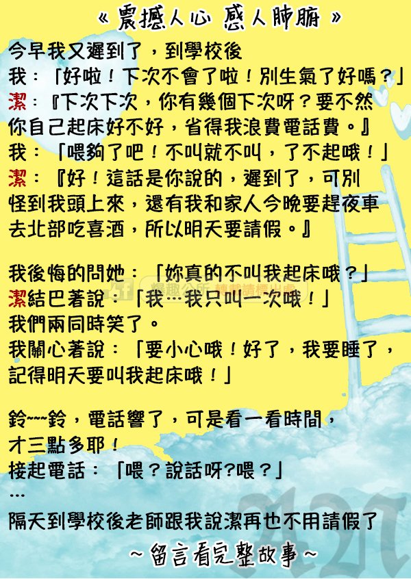 潔:「別再睡了,要不然…我….我無法叫你了…上..上學要….小心車子啊!」