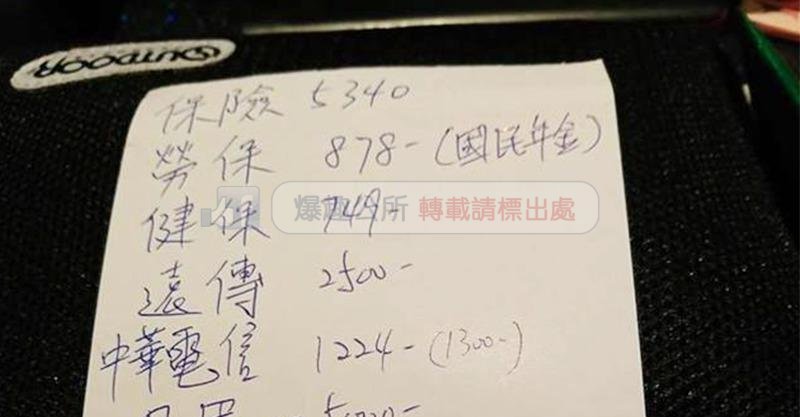 保險5340元,勞保878元,健保747元,遠傳2500元,中華電1224元,月眉租屋5000元,台電水費1200元,中信8000元,車貸11000,每月總支出約36000元!