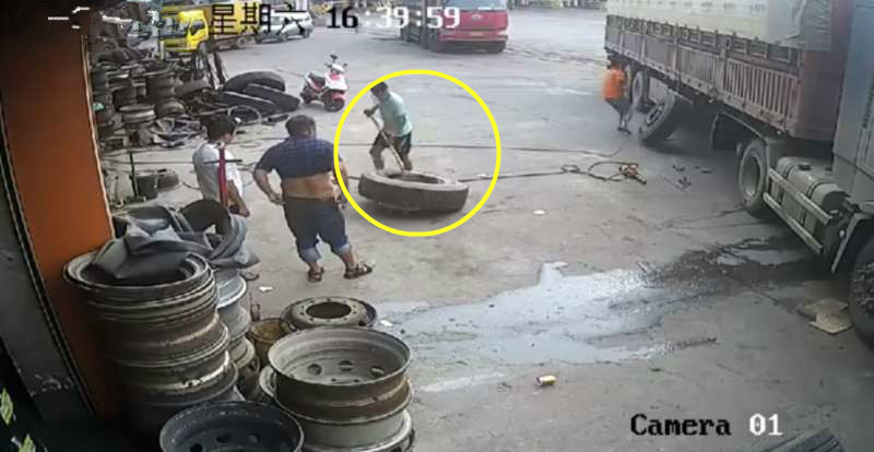 ✪監視器一開始可以看到,大家都在做事,看起來就像一般的工作天一樣。最右邊的男子則是在幫輪胎充氣。