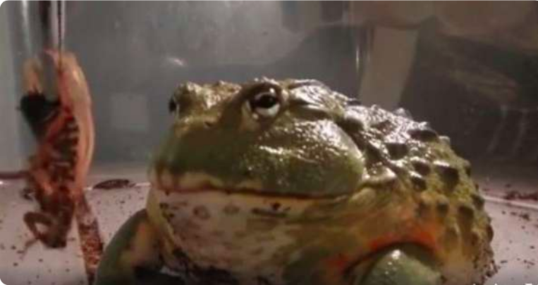 雜食性的非洲牛蛙只要給牠任何東西,還沒過幾秒鐘就會被牠整個吞進肚子裡,可怕的用餐態度連人類也會懼怕牠。日前有網友將一大群的蟑螂丟給自己飼養的非洲牛蛙享用,結果蟑螂們的下場實在讓痛恨牠們的人都看得超過應!
