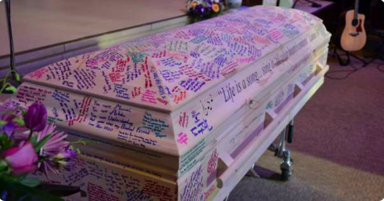 ▼不幸的是,蘿拉的癌症在11月再度復發,儘管她努力地接受治療,在今年的1月,蘿拉還是離開了人世。因為蘿拉無法從高中畢業,也領不到畢業證書,她的同學們就在她的棺材上寫下了所有想對她傾吐的話,希望蘿拉在天堂能夠看得見…