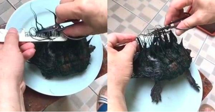 在男子將這只“綠毛龜”帶回家後,看著烏龜身上的綠色毛髮覺得十分的礙眼。然後就找來工具,將烏龜身上的毛髮全部剪掉了。