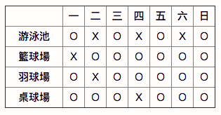 甲的運動場今天有開放明天沒開放,星期二完全沒有符合這個條件的運動場,