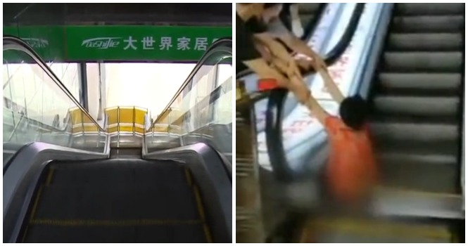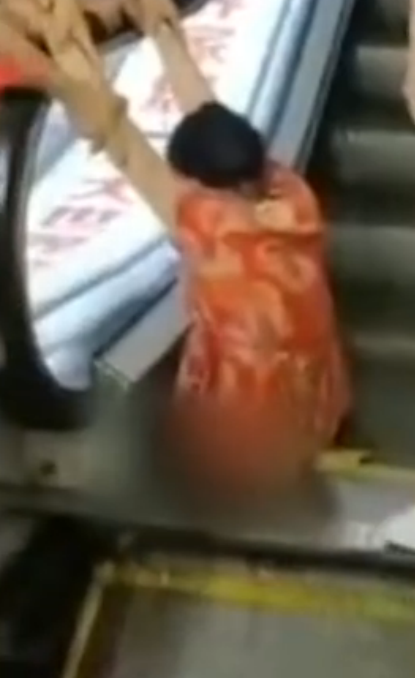 不幸的是,對於這位大嬸來說,她在哈爾濱中國黑龍江一家購物中心搭乘手扶梯時失去了一條腿。