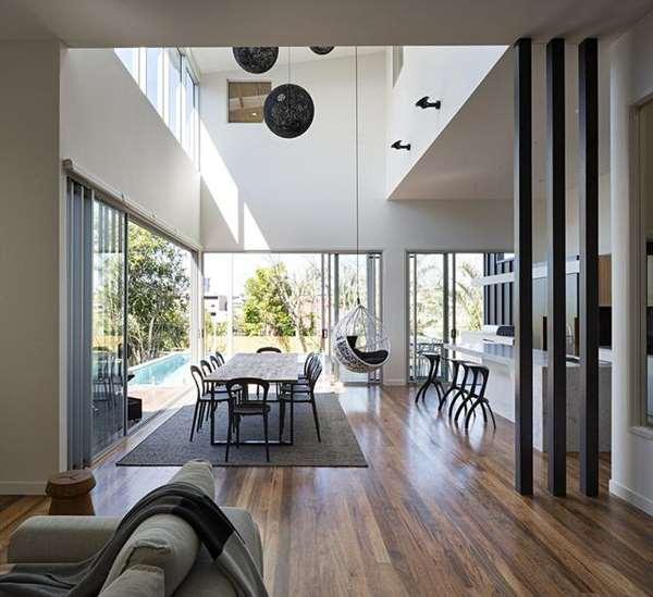 從照片中可以看到改造後的房子總共三層樓,不僅天花板挑高,也以玻璃代替牆面,拉大整體的空間感,屋內的採光也變得更好了,他們甚至在院子裡裝設了一個游泳池呢!