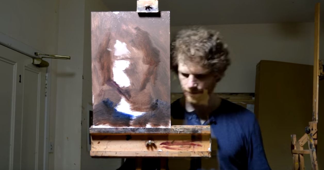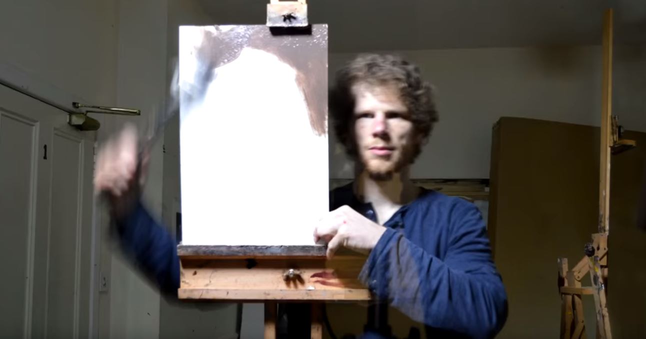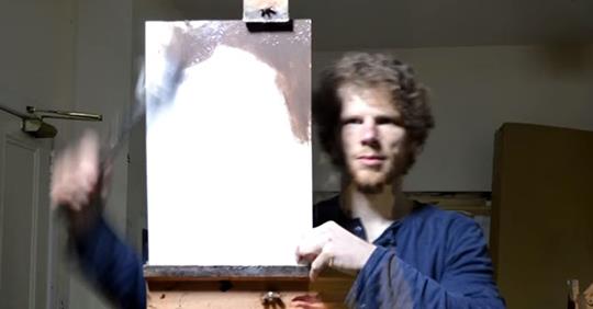 麥克盧爾竟然突發奇想,決定要站在鏡子前面「反著畫肖像」,一開始他在畫布上不停塗上顏色,從下面這張照片來看,完全搞不清楚他究竟想要畫什麼。