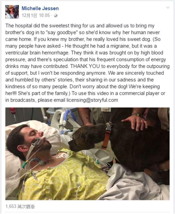 後來這段影片是由Ryan的妹妹Michelle Jessen分享於臉書上,感謝醫院的包容,讓哥哥的愛犬能有最後相處的時間:「謝謝醫院造就我們有了這段溫暖的故事,讓Mollie有機會來到哥哥的病榻前道別,明白主人再也沒辦法回家了。雖然我無法逐一回覆每個人的關心,不過非常感謝大家的祝福,我們也會好好照顧Mollie的,畢竟牠是我們家的一份子。」