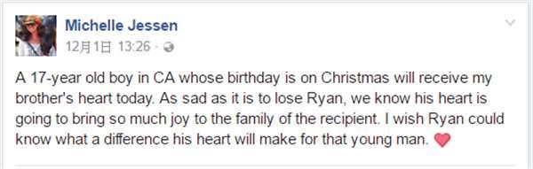 雖然再不捨、難過,但家人最後仍選擇讓Ryan遺愛人間,幫助有需要的人重生。事後Michelle在臉書上寫道:「當天,一名加州的17歲少年接受了哥哥的心臟,將在他的生日當天那就是聖誕節那日進行移植手術。雖然哥哥已經不在人世了,不過我們知道他的心仍在世界的某一角努力地跳動著,我很希望Ryan可以知道,他的離去改變了那名17歲男孩的人生。」