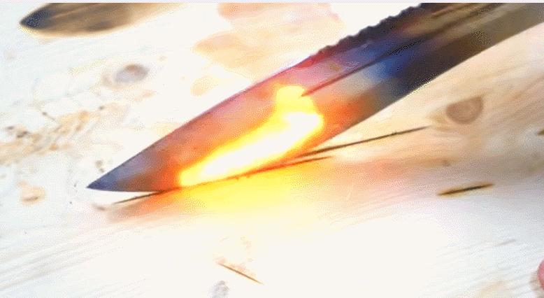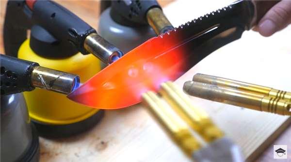 首先這個頻道名稱為MrGear的YuuTuber,先是將預先準備好的利刃,放置於熊熊火焰的噴槍上,讓冰涼的刀子在火上烤到熾紅。