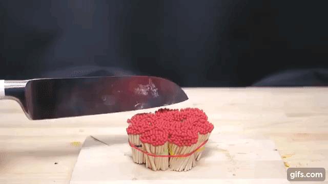 萬事俱備以後,他先將高達1000℃的刀,用於木製的砧板上做測試,沒想到只要接觸到刀子的地方,全都化成一條黑碳並且起火。