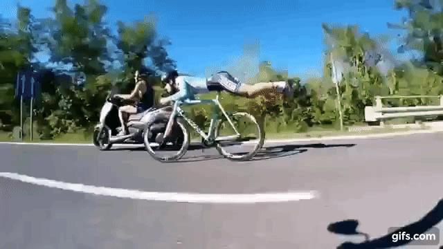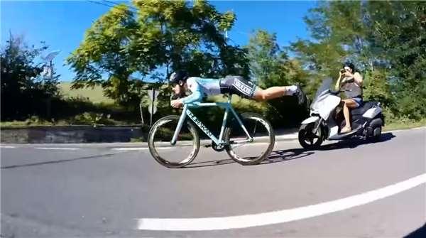 好誇張,沒想到切換成與地面平行的超人姿勢後,麥可的自行車就像是開了掛一樣,全力加速前進,甚至超越引領的機車,不過最大的亮點大概還是那個表情驚呆,放雙手拍照的機車騎士吧!分享出去,讓大家看到這個有趣的影片吧!