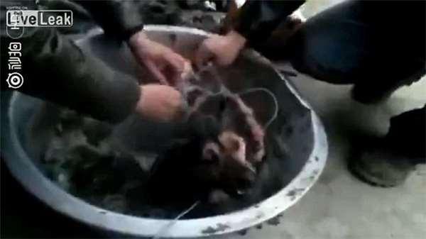 正當其中一名男性將鐵盆拿起後,赫然見到一隻黑狗四肢滾綁起來,在滾燙熱水中掙扎,然而這幕畫面無疑震撼了許多看過影片的人,畢竟這些人怎麼將活生生的狗放在熱鍋裡煮熟。
