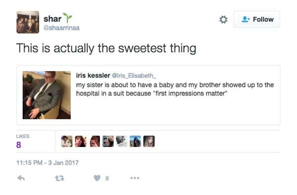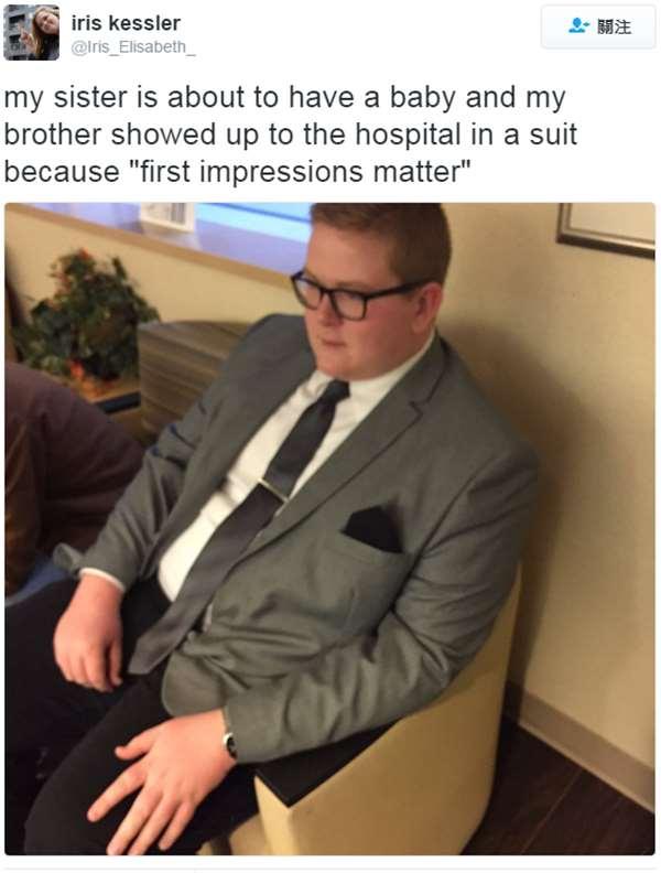 在Iris的詢問之下,而得出的答案令人哭笑不得,「我姐要生小孩了,結果我哥穿著正式服裝來到醫院,只因為他認為『第一印象很重要』。」