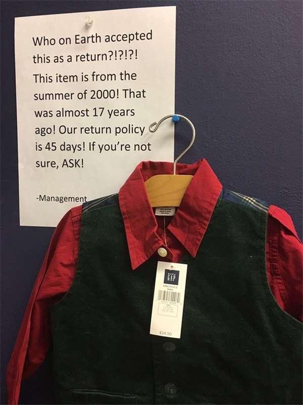 美國知名服飾店「GAP」,近日收到消費者將17年前販售出去的衣服拿回來退,不料受理的店員並沒有注意到,反而白白將24.5美金(折合台幣780元)的錢還給顧客,讓發現的店經理大為光火,將收到退貨衣服掛起來,並在一旁貼上紙條,質問到底是哪位天兵店員幹的事。
