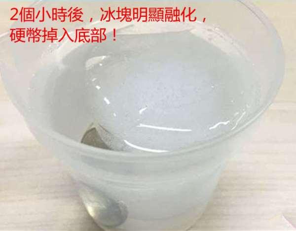 這樣的方法真的可行嗎?家電產品導購資訊網站「萬維家電網」進行了實測。等杯中的水冷凍,放好硬幣後,他們拔掉冰箱電源,打開冰箱門,把杯子置於普通環境中。1個小時後,冰箱裡面的硬幣位置沒有變化,但冰塊有裂紋,表層有融化痕跡,2個小時後,冰塊已經有明顯融化,硬幣已經滑入杯底了。