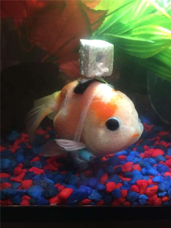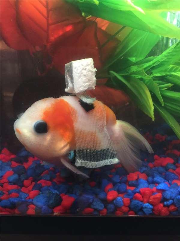 雖然在水族館工作的Derek年僅20歲,不過特愛鑽研的他還是絞盡腦汁地坐出輪椅,輔助金魚能在水缸中如同往常般輕鬆優游,他說:「把空氣管圍在金魚身邊,底部加了個閥門,作為一個『椅子』來支撐牠。頭部再掛著一顆保麗龍有效地讓牠得到適當的浮力。」