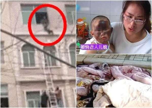 同一時間待在屋內的爺爺也奮力地將孫女高舉於窗口外,目擊一切的水果店女店員表示:「他撐了30分鐘左右,可能是撐不住了,身子往下慢慢縮,月月的衣服也隨著從頭上脫了下來,眼看著月月掉下來,最後落在大家撐起的被子上,他才放心的倒入熾熱的火場中喪生。」