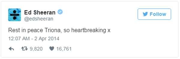 當紅髮艾德接獲少女病逝的消息後,也在推特上進行悼念:「願Triona能夠安息。」