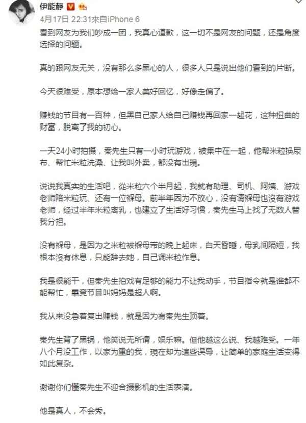 對於外界對老公的批評和抨擊,伊能靜當然也都看在眼裡,也替老公感到委屈,她因而在微博上寫了一段維護老公的「解釋文」,表示其實因為有秦昊,自己的經濟壓力小很多,根本不需要急著復出賺錢,而會參加這個節目,是希望能替家裡留下美好的回憶,坦言一整天24小時的拍攝過程,秦昊僅有一小時玩遊戲,「他幫米粒換尿布,幫忙米粒洗澡、讓我叫外賣,都沒有(在節目中)出現。」