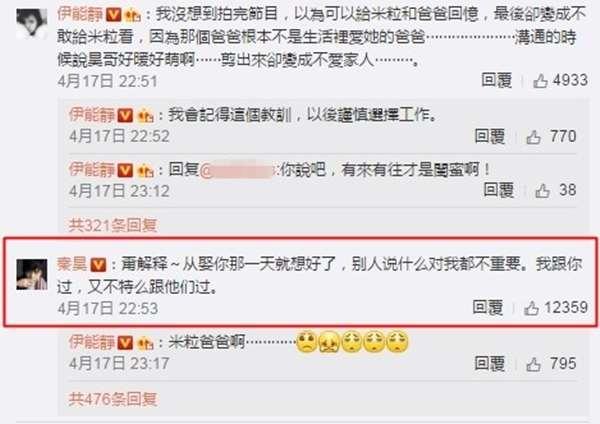 對此,秦昊則親自在伊能靜PO文下方留言,要太太不用再解釋,「從娶你那一天就想好了,別人說什麼對我都不重要。我跟你過,又不特麼跟他們過。」一番言論令愛妻感動不已。