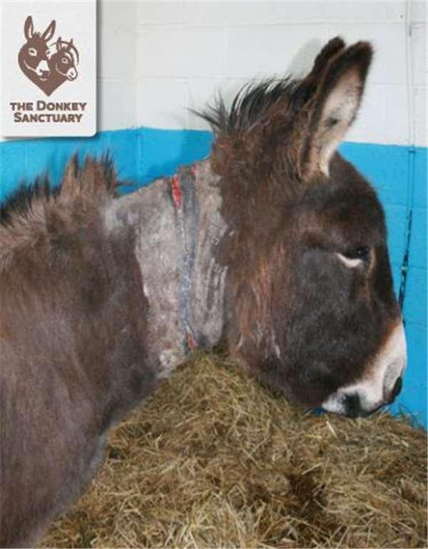因為有過切身之痛,所以更懂得用愛來撫慰需要的人…這頭驢名叫Shocks,當動保人員發現牠時,正躺在愛爾蘭的一處農場上,由於遭受農場主人長期拴養,造成牠的脖子明顯勒出一圈血痕,無知的主人甚至還在牠的傷口上淋下漂白劑,意圖幫毛驢止血,無奈卻是讓牠病情加重。