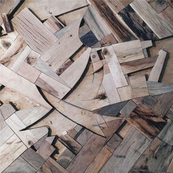 所有的木地板都黏好後,Alexey開始著手於「鳥」的製作,利用大小不一的磁磚排出鳥的形狀。