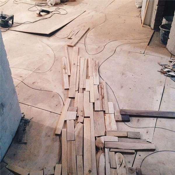 所有木材準備待續後,Alexey先將這些木材烘乾,要不然使用上潮濕的木片,可是會因為熱脹冷縮的關係讓排列好的成品出現損壞的情況,一旦萬事俱備後,Alexey把10mm的膠合板放在扁平的混凝土地板上,再將一塊塊木片黏在上頭。