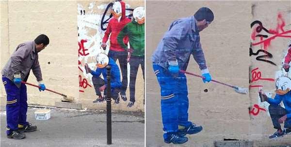 Combo親眼目睹了自己嘔心瀝血的創作被人清除,還把這一幕拍了下來,不過當下他並沒有生氣,也沒有出聲制止清潔工的行為,他心裡已經打算好,決定用灰諧的態度反擊,不愧是充滿想像力的藝術家,他的俏皮改造再次讓人會一心一笑。Combo直接把自己拍到的畫面整個複製貼上。