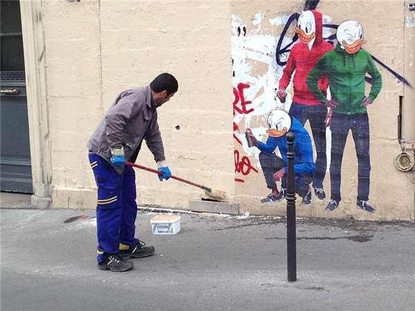 Combo是一名法國的街頭藝術家,熱愛塗鴉的他曾經在一條街的牆壁上創作一幅非常逗趣的塗鴉,是三名有著唐老鴨面容的男子拿著噴漆在塗鴉的畫面,俏皮風格獲得好評。不過這幅特別的塗鴉卻被一名清潔工用牆壁的顏色粉刷,覆蓋了原本的作品。